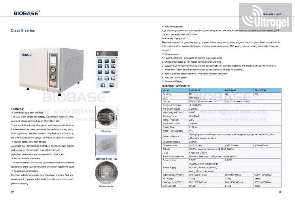 Electro-polished, steam-heated chamber shell with touch screen, colour LCD display, built-in steam generator, liquid ring vacuum pump, water recirculation system and painted steel casing. Supplied as standard with stainless steel tray holder, one small and one large tray, tray gripper gloves, RS232 communication port and built-in inkjet printer