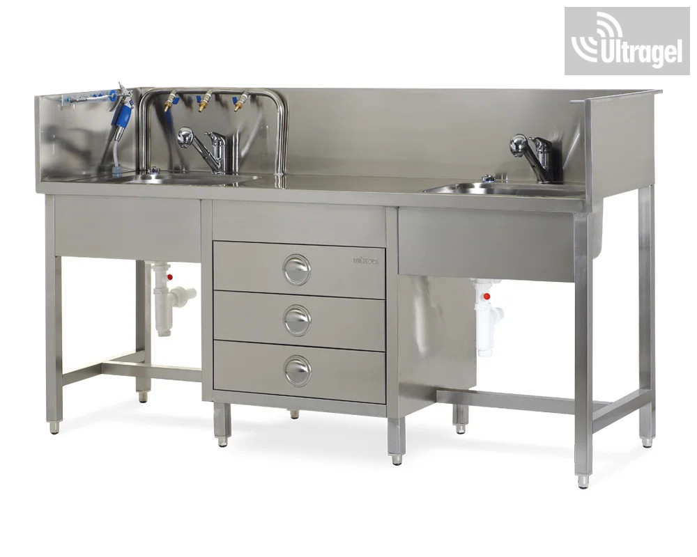 A Mixta előmosó munkaasztal nyomás alatti permetező pisztollyal, keverőcsaptelepekkel, valamint mosó és áztató medencékkel van felszerelve, amelyek lehetővé teszik az eszközök alapos tisztítását a sterilizálási folyamat megkezdése előtt.